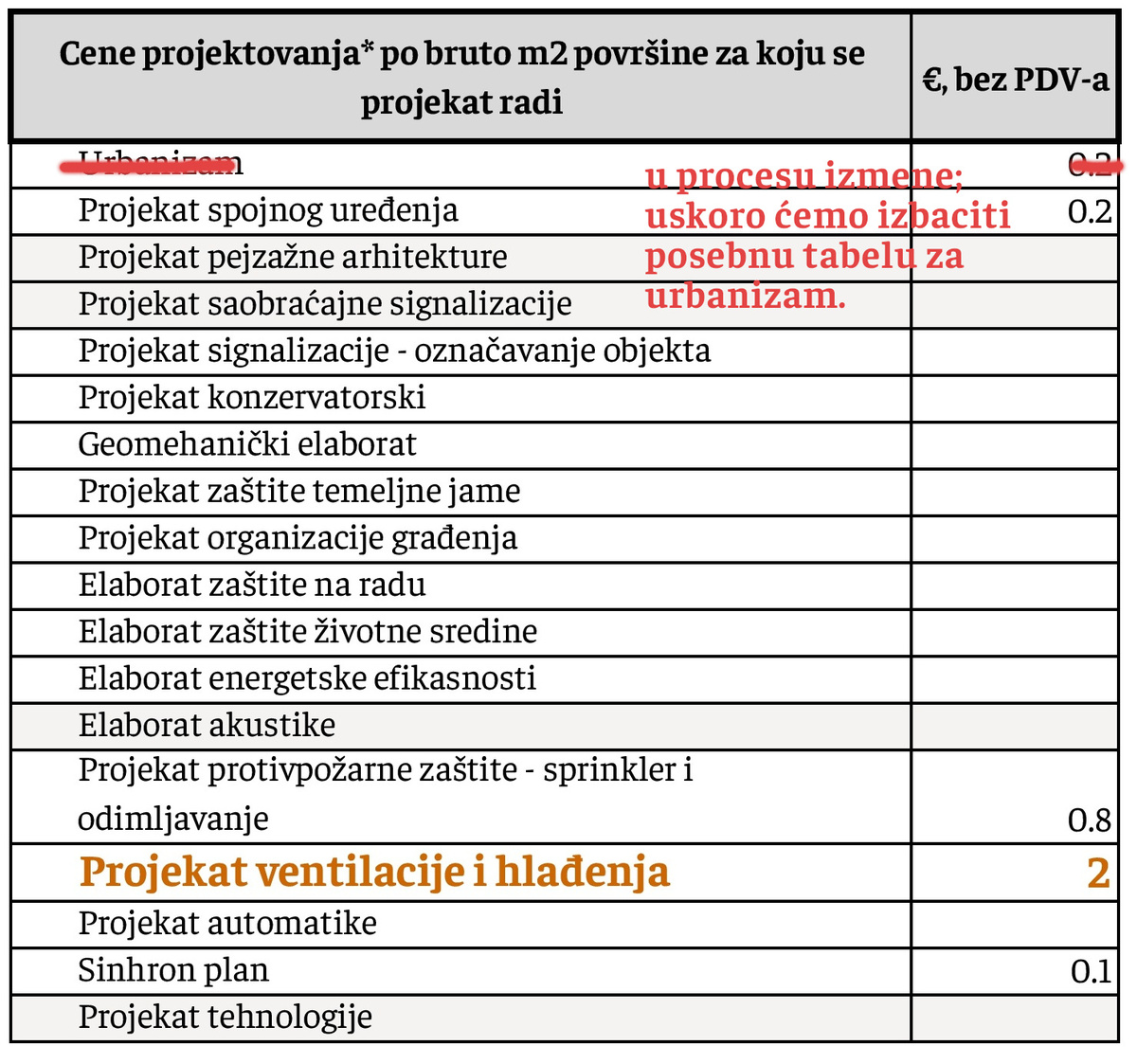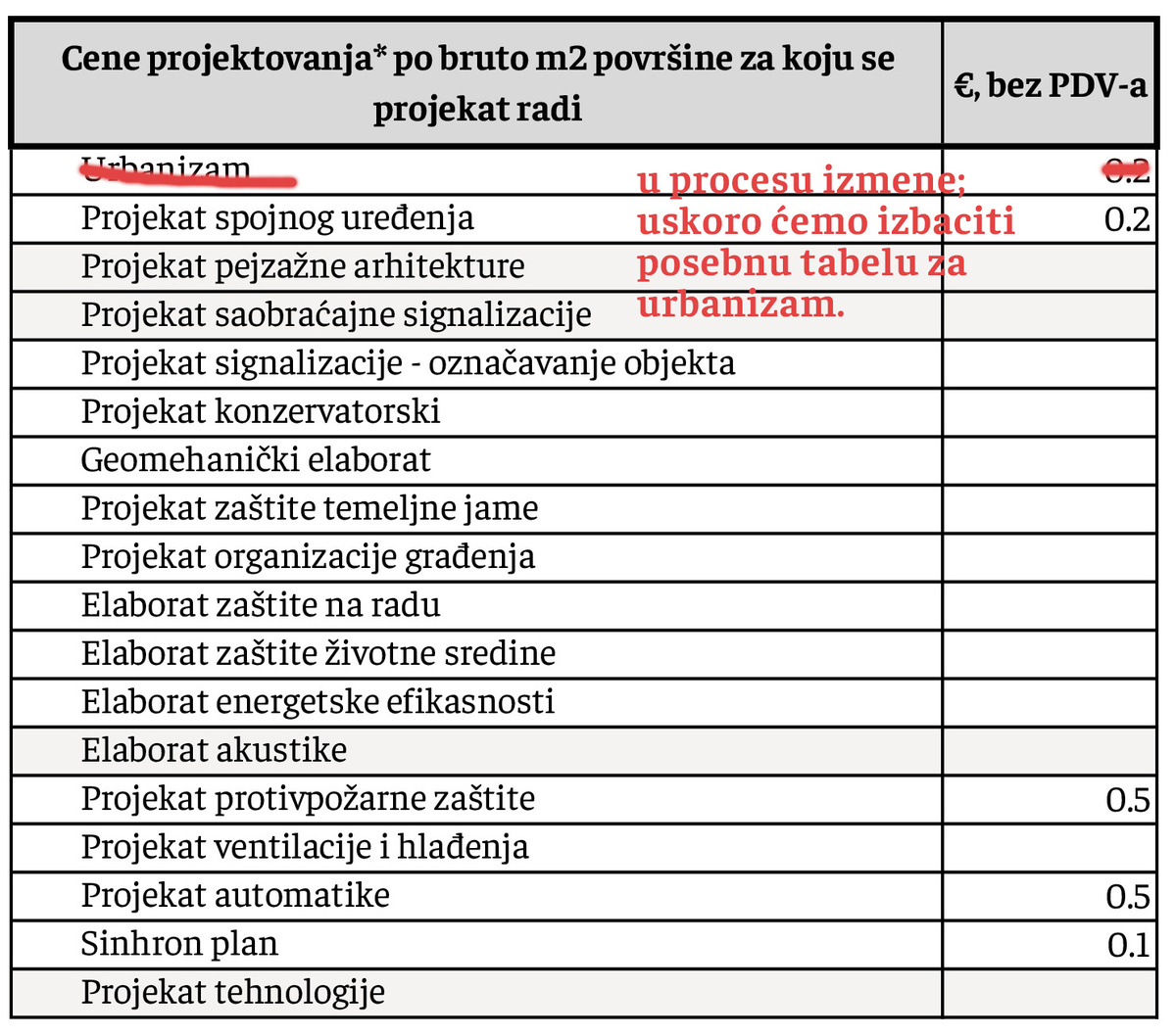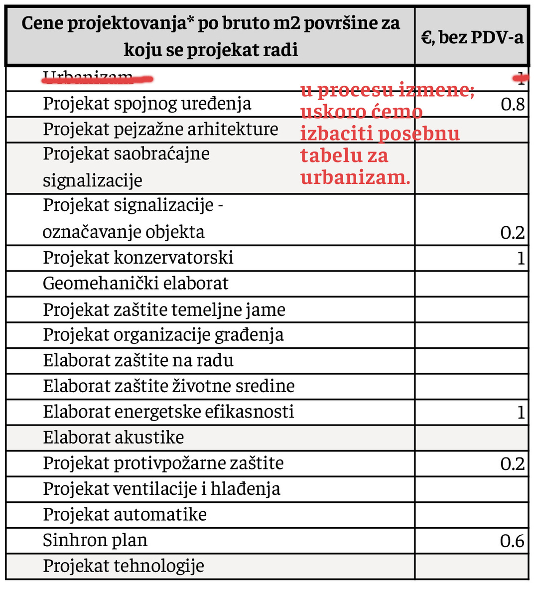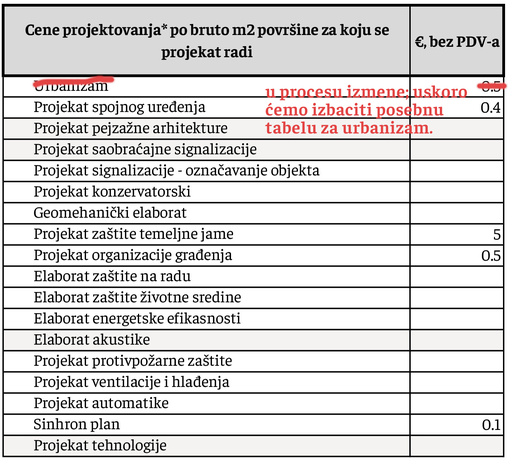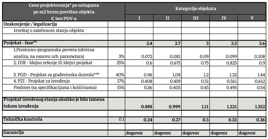 **za rekonstrukcije objekata, primenjuju se cene kao za fazu PGD.