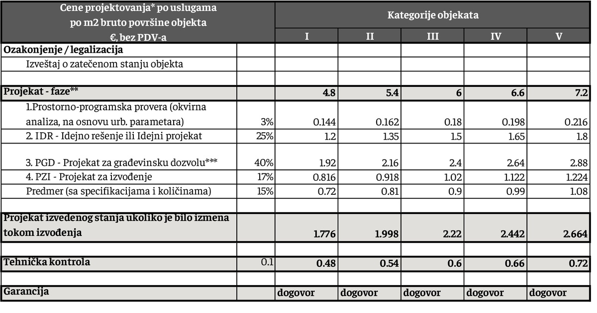 ***Prema važećem zakonu, projekat za građevinsku dozvolu (PGD) je pojednostavljen radi bržeg dobijanja dozvola. Međutim, smatramo da je neophodno da projektant na vreme pripremi projekat za fazu izvođenja. PGD mora biti dovoljno precizan u tehničkom smislu (da svi detalji budu razrađeni) za nastavak sledeće faze, čak i ako svi crteži nisu spremni za predaju. Ovo zahteva dodatni rad, zbog čega je cena PGD-a znatno veća u poređenju sa ostalim fazama, posebno u odnosu na Projekat za izvođenje.