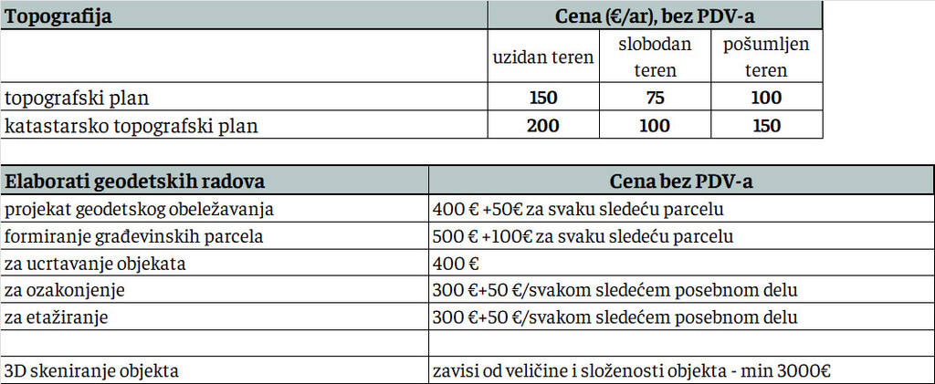 Cene date u tabelama u nastavku se odnose na ugovore koji se sklapaju sa jednom firmom, za jedan projekat.