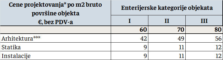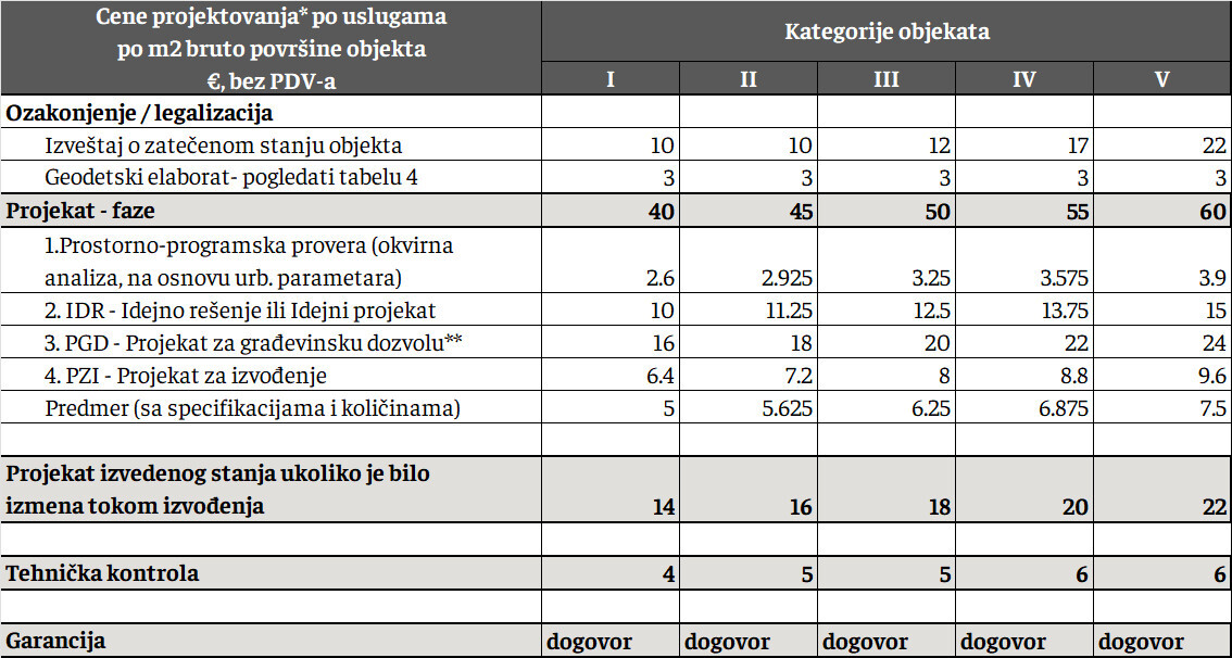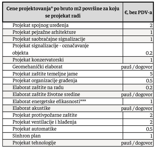 | Projektovanje do tendera | projekat koji se radi do PZI. Svako dalje projektovanje u fazi izvođenja se dodatno naplaćuje |