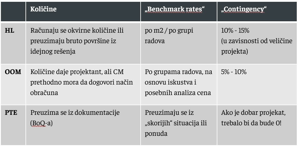 U inostranstvu se radi kada Investitor usvoji idejno rešenje (Shematic Design), a kod nas kada usvoji rešenje koje treba da se razradi u projekat za građevinsku dozvolu. Nažalost, pošto se predmer i predračun ne rade na ovom nivou, često inostrani investitori imaju problem kome da dodele obračun količina (projektantu ili nezavisnoj konsultantskoj firmi) i najčešće to moraju dodatno da plate.