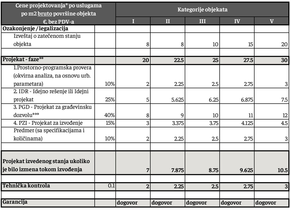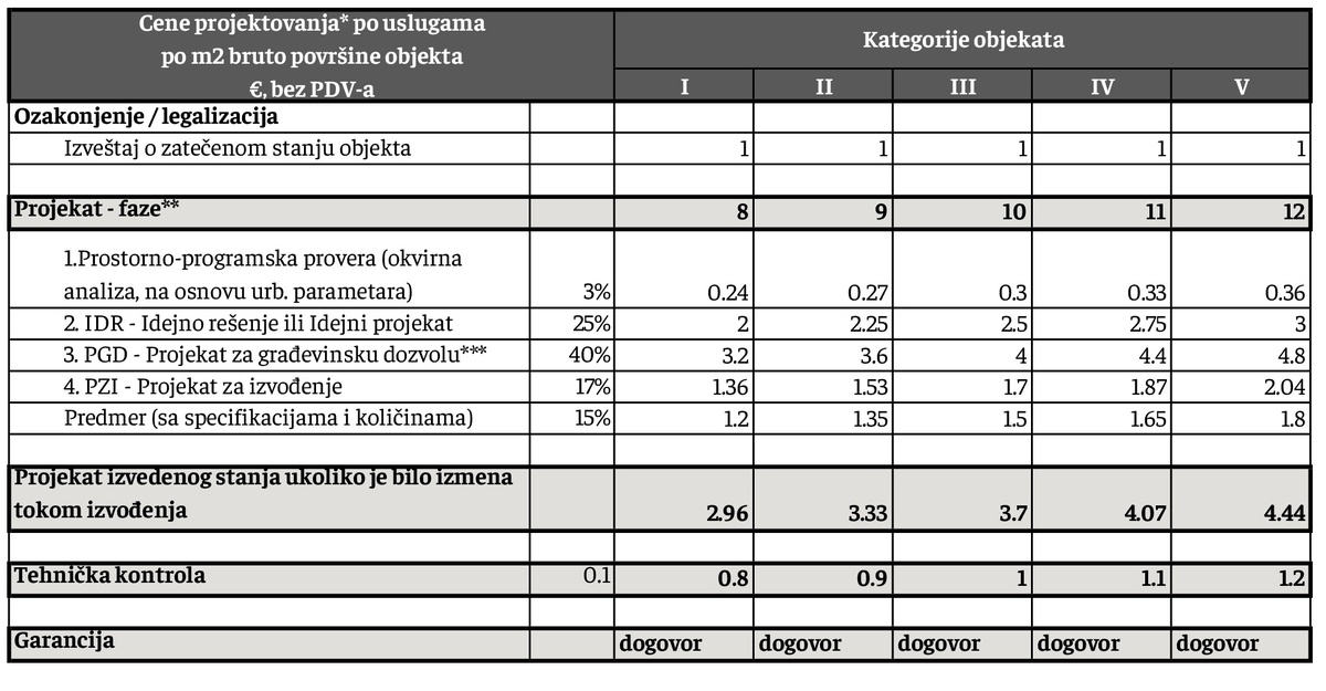 ***Prema važećem zakonu, projekat za građevinsku dozvolu (PGD) je pojednostavljen radi bržeg dobijanja dozvola. Međutim, smatramo da je neophodno da projektant na vreme pripremi projekat za fazu izvođenja. PGD mora biti dovoljno precizan u tehničkom smislu (da svi detalji budu razrađeni) za nastavak sledeće faze, čak i ako svi crteži nisu spremni za predaju. Ovo zahteva dodatni rad, zbog čega je cena PGD-a znatno veća u poređenju sa ostalim fazama, posebno u odnosu na Projekat za izvođenje.