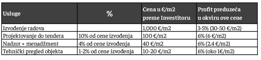 Kako bismo dobili jasniji pregled okvirnih cena usluga u građevinarstvu, predstavljamo jednostavnu tabelu koja ilustruje približne vrednosti koje treba da dostignemo. Kako bi skok sa 20 €/m2 na 100 €/m2 bio previsok, predlažemo da se to uradi postepeno. Imajte na umu da ovaj prikaz služi samo kao orijentacioni pokazatelj i da je neophodno pažljivo formirati cene, uzimajući u obzir detaljne tabele u nastavku.